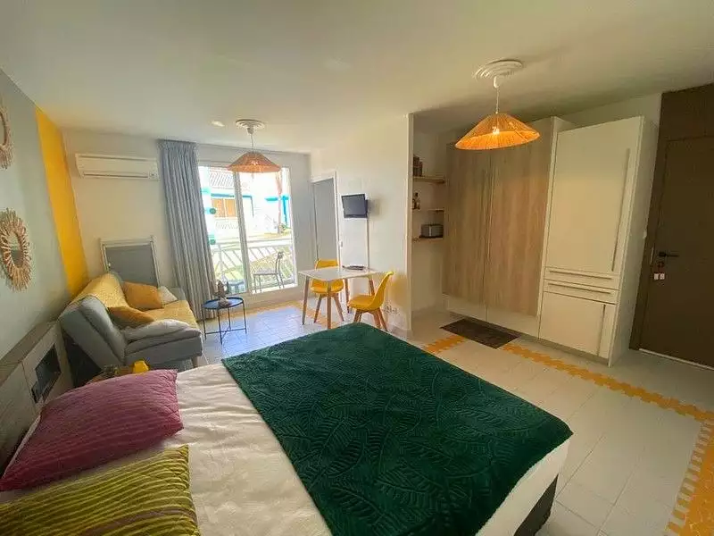 Ce joli studio meublé aux tendances actuelles, comprend un lit double en 160 cm, un espace salon avec son canapé et sa table basse, un coin repas, une kitchenette intégrée et un balcon/terrasse. Situé au rez-de-chaussée, vous disposerez d'un accès direct à la plage, d'un accès piscine avec abonnement annuel, d'une galerie commerçante avec entre autres une supérette, une laverie, et bien d'autres boutiques à découvrir sur place. Face au lagon, un bar/restaurant et un espace petit déjeuner.