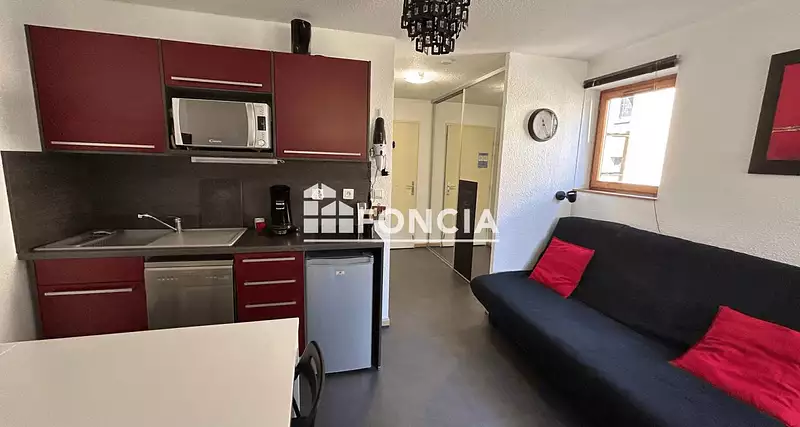Niché au cœur de la station avec accès immédiat à toutes les commodités, cet appartement séduisant vous offre un espace de vie fonctionnel et bien agencé. L'entrée avec son grand placard dessert une kitchenette entièrement rénovée et parfaitement équipée, ainsi qu'une chambre confortable et un coin montagne donnant sur une loggia de 5m².