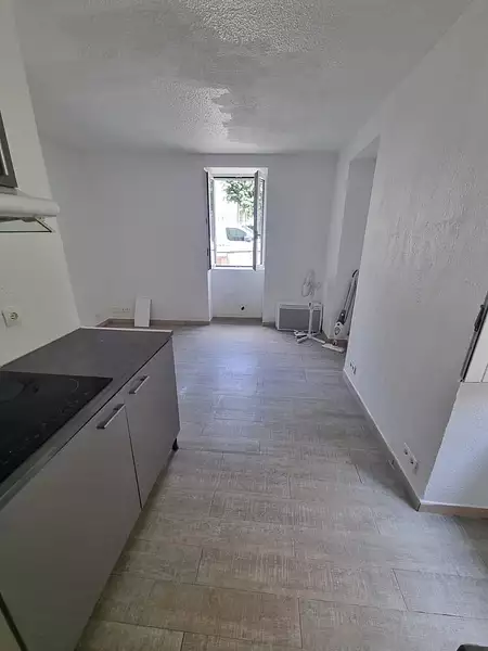 Parc Chambrun, dans immeuble niçois, appartement de 2 pièces de 26.33m2 comprenant entrée, séjour avec 2 fenêtres, cuisine américaine, chambre, sde et wc.