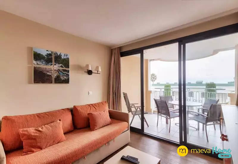 Appartement séduisant, balcon exposé sud-est offrant une vue sur la mer et les Îles de Lérins. Piscine à débordement commune, plage à deux pas, parking inclus.