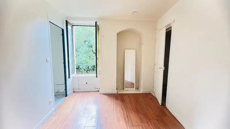 En arrière-cour, en retrait de la circulation, au calme : type 2 de 27.09m2 à rénover comprenant un espace de vie avec coin cuisine, une chambre, salle d’eau avec wc. Devis de rénovation et DPE projetés seront présentés lors des visites