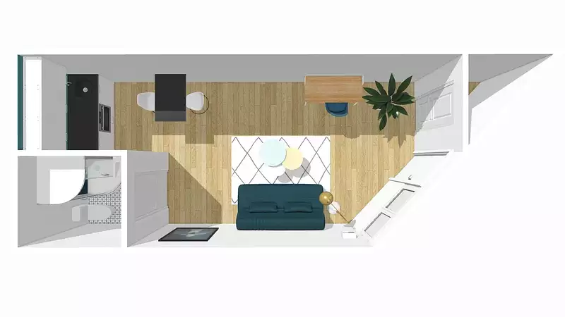 Le studio se compose d'une pièce de vie de 20m2, une salle de douche avec WC, un coin cuisine, et un dressing fermé. La fenêtre donne sur les jardins de la résidence, sans vis à vis direct ou proche.