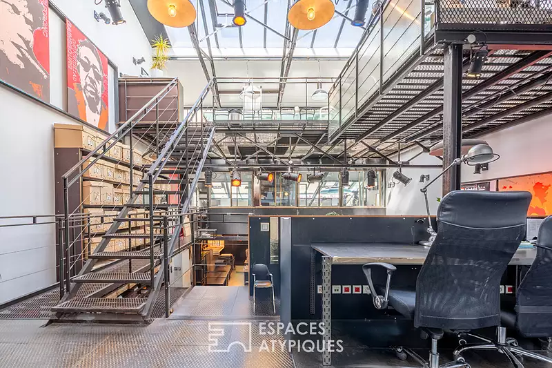 A quelques pas de la Halle Secrétan, entre le canal et les Buttes-Chaumont, ce local industriel développe une surface de 312m² au sol (264,81 m² Carrez), répartie sur trois niveaux, avec une hauteur sous plafond qui tutoie les 7,30 mètres et une terrasse en jouissance exclusive de 47m² . Occupant l'arrière d'un immeuble sur cour, au calme absolu, l'espace présente aujourd'hui une structure brute aménagée en bureau et qui pourrait être réhabilitée en habitation. Murs en béton, ossature métallique, escalier industriel et verrière zénithale composent une base solide pour un futur projet de transformation. Le volume principal, accessible depuis la terrasse en rez-de chaussée, est baigné de lumière grâce à ses ouvertures en toiture et offre un plateau libre aux proportions généreuses. Le bien peut accueillir plusieurs scénarios : un loft d'habitation avec espaces ouverts et pièces en double hauteur, un espace professionnel avec bureaux et showroom, ou encore deux unités distinctes en cas de division (sous réserve des démarches administratives nécessaires). Le changement de destination est à envisager dans le cadre d'un projet global. L'ensemble offre un potentiel rare dans ce secteur recherché du 19e arrondissement en plein essor proche des transports, des commerces de bouches, des restaurants et lieux de vie sportifs (salle d'escalade, piscine Pailleron) et culturels. Un lieu brut, aux volumes parlants, pour une page à écrire en grand format. Bien soumis au statut de la copropriété. Métro : Jaurès, Bolivar, Colonel Fabien CLASSE ENERGIE : C/ CLASSE CLIMAT : C. Montant des dépenses annuelles d'énergie 2023 : 2968 euros (abonnement compris). Les informations sur les risques auxquels ce bien est exposé sont disponibles sur le site Géorisques : https://www.georisques.gouv.fr. Contact : Magaly 06 63 16 83 32 - RSAC : 908 772 452 PARIS Copropriété de 46 lots - dont 36 lots habitation. (Pas de procédure en cours). Charges annuelles : 2762 euros. Magaly Leygnac (EI) Agent Commercial - Numéro RSAC : 908 772 452 - Paris.