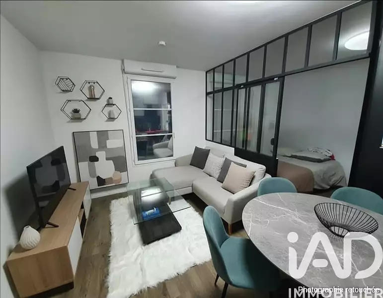 Entrée sur salon séjour avec cuisine ouverte et équipée, coin chambre aménagée avec verrière séparative.