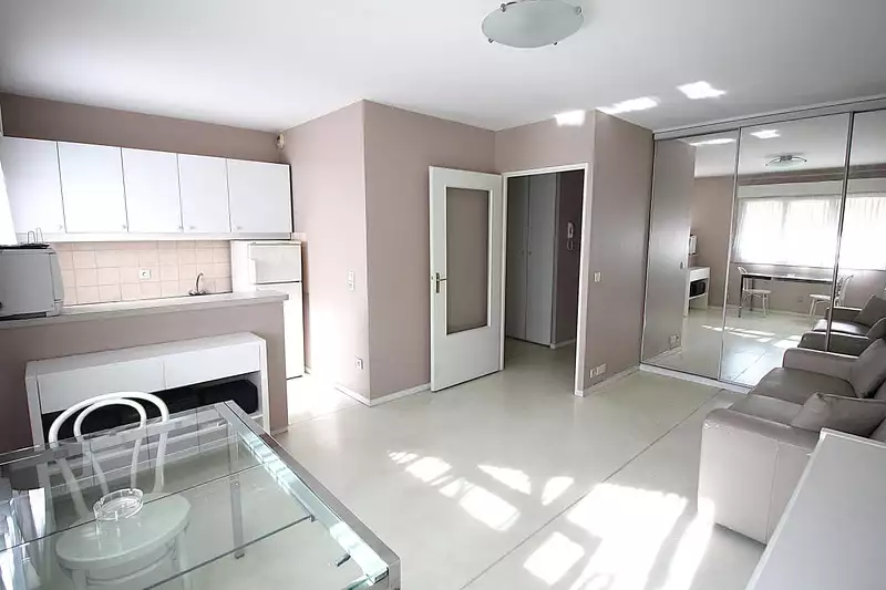 Le studio est composé d'une entrée avec un placard (ballon d'eau chaude et rangements), un grand séjour/cuisine de 21 m² avec penderie intégrée, un WC, une salle d'eau.