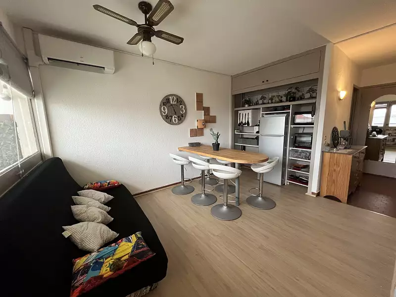 Port Leucate, Résidence en bord de plage, au 1°étage, comprenant : entrée, chambre, cabine, séjour coin cuisine, salle de bains, wc. Terrasse. Vendu meublé.