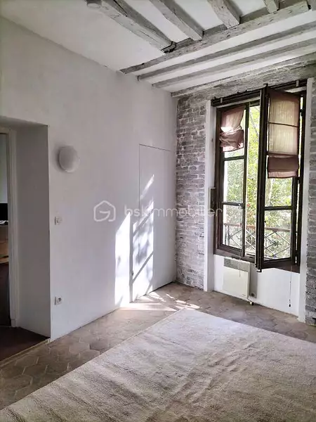 Appartement avec beaucoup de cachet et composé de 2 pièces. Poutres apparentes, briques, tomettes au sol :