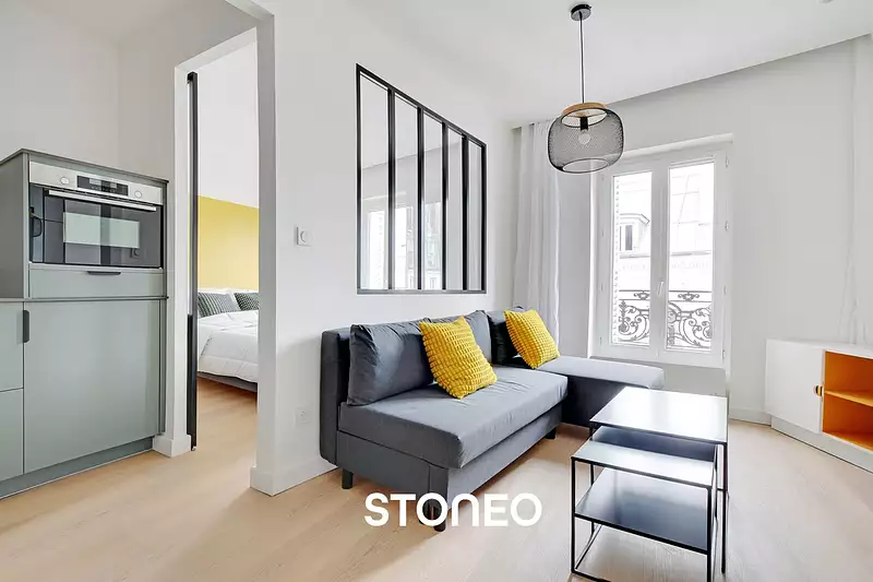 Entièrement rénové, l'appartement comprend une entrée ouvrant sur un séjour avec cuisine entièrement équipée, une chambre, ainsi qu'une salle de bains avec WC sanibroyeur. Il offre également de nombreux rangements intégrés.
