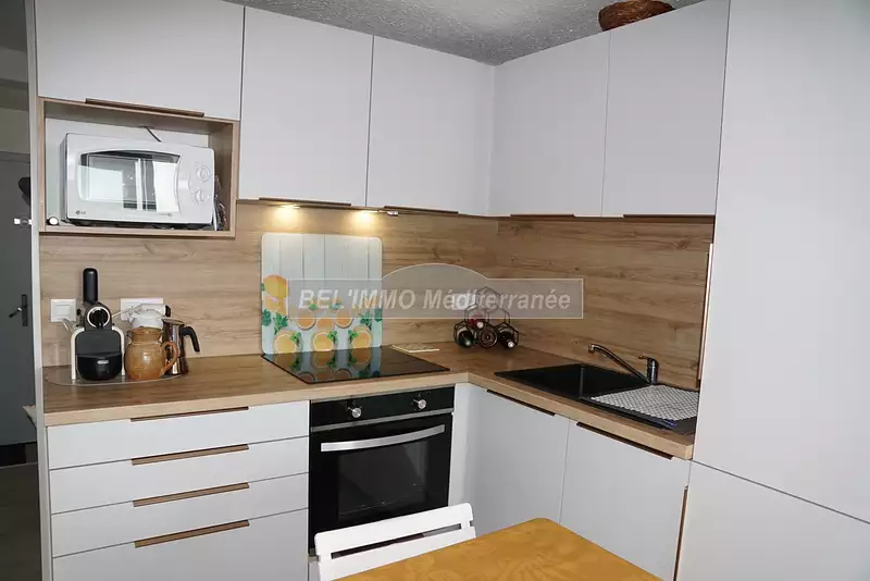 Très joli Studio-Cabine vendu meublé-équipé et comprenant : entrée avec rangement, séjour avec belle cuisine entièrement équipée, coin cabine, salle d'eau meublée, WC séparés (et avec lave-linge).