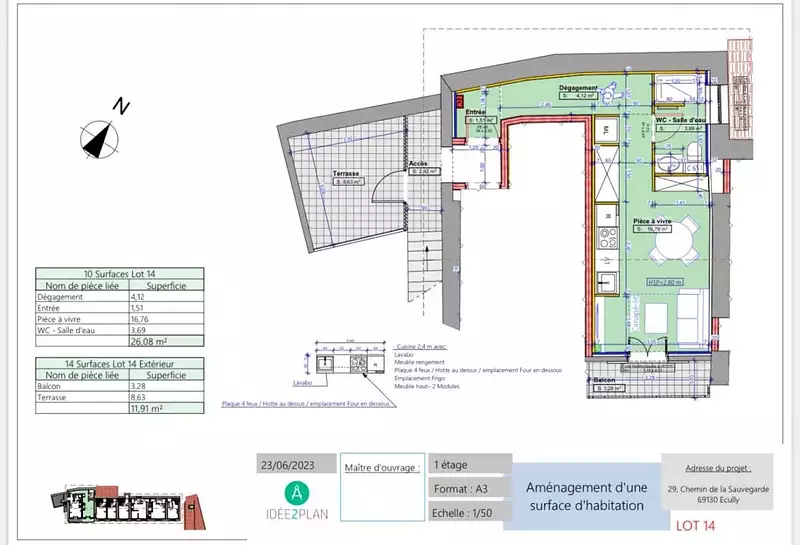 Ce grand studio de 26,08m2 se compose d’une pièce à vivre, d’une cuisine ouverte donnant sur une terrasse d’environ 9m2 et d’un balcon d’environ 4m2 ainsi que d’une salle d’eau avec WC.