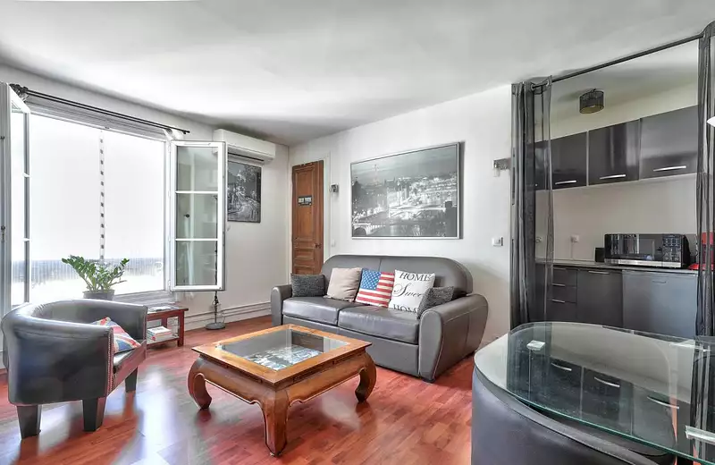 Ce bien se compose d'une entrée, d'une pièce de vie baignée de lumière, donnant sur une cour vous garantissant un calme absolu et une vue dégagée sur les toits de Paris. La cuisine équipée (réfrigérateur sous plan, lave-linge) est ouverte sur la pièce de vie, une salle de bains avec WC avec fenêtre.