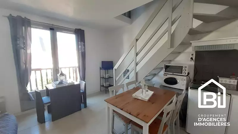 Résidence les Manoirs Normands II, proche de la plage Un charmant F2 en duplex composé d'un séjour-cuisine, WC, placard, Une chambre et une salle d'eau à l'étage. Balcon avec vue dégagée. Vendu meublé, beau produit ! Résidence avec faibles charges. Exclusivité Bi. (7.45 % honoraires TTC à la charge de l'acquéreur.) Copropriété de 438 lots - dont 182 lots habitation. (Pas de procédure en cours). Charges annuelles : 621 euros.