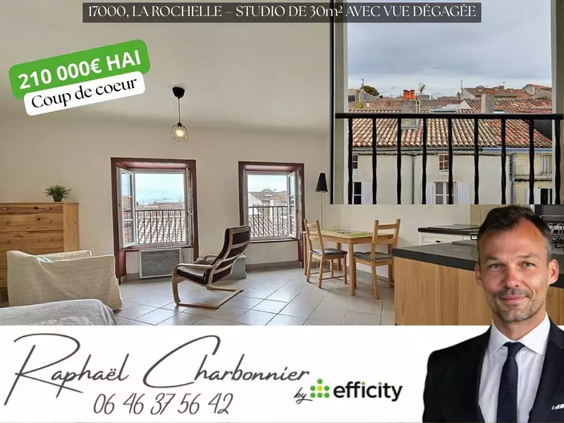 Raphaël Charbonnier vous présente en exclusivité ce studio lumineux d'environ 30 m², situé en hypercentre de La Rochelle, à seulement quelques mètres du vieux marché, dans une petite ruelle sans passage, au calme absolu.