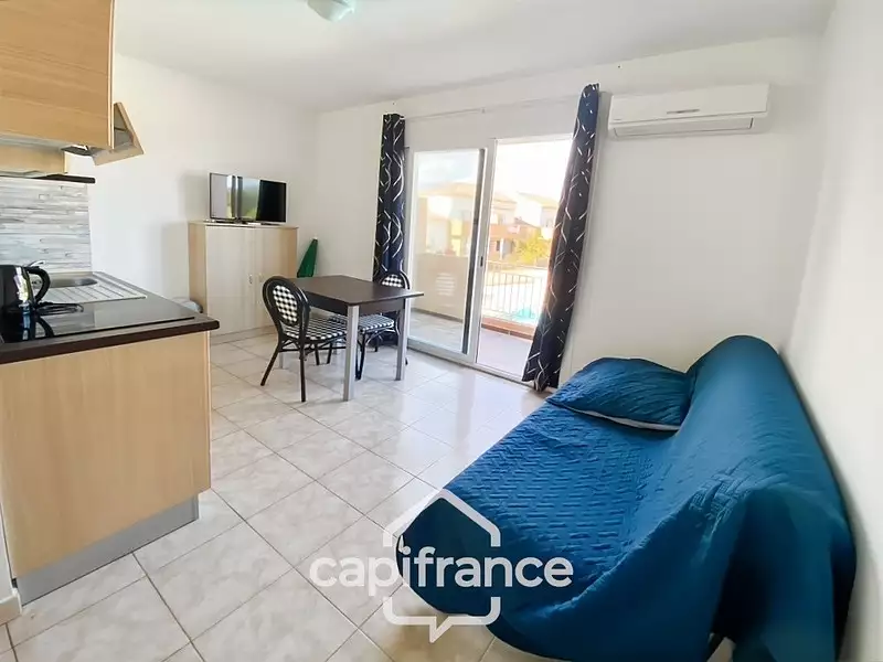 LINGUIZZETTA, à 5 minutes de plages, au sein d'une résidence avec piscine, appartement type 2 composé d'un séjour/cuisine, une chambre et une salle d'eau.