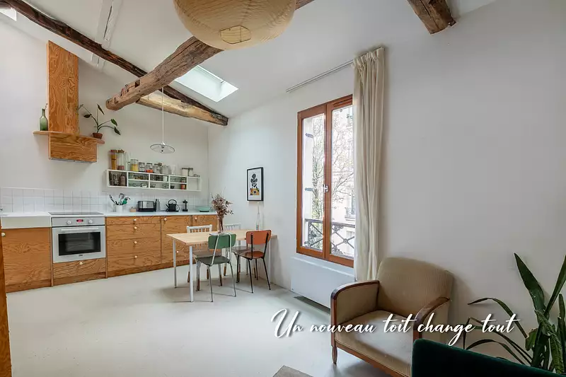 Pensé dans les moindres détails, l’appartement offre une magnifique hauteur sous plafond, sublimée par des poutres apparentes et une lumière zénithale rare, grâce à ses ouvertures en toiture orientées ouest, garantissant une atmosphère chaleureuse et lumineuse toute la journée.Aucune perte de place : l’espace a été optimisé avec une grande intelligence.