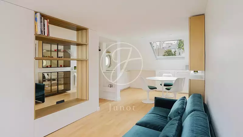 Au sein d'une copropriété bien tenue de la rue Chaptal, somptueux appartement de 34,42m² au sol et 30,18m² loi Carrez au cinquième et dernier étage par ascenseur entièrement rénové par l'architecte Filippo Francescangeli.