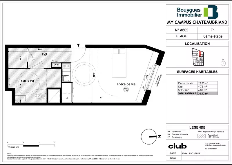 | 30,13 m² - 1 pièce | 6ème étage avec ascenseur |