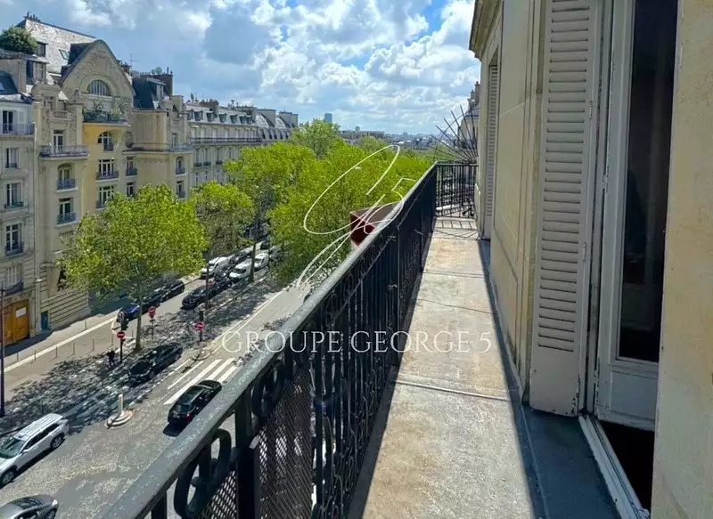 Rare duplex lumineux vue Tour Eiffel avec balcon filant de 316,89 m2, situé aux 5 et 6ème derniers étages, par ascenseur, d'un immeuble Haussmannien de standing, surplombant une superbe avenue parisienne, à deux pas de l'Etoile, de l'avenue George V et des Champs Elysées.