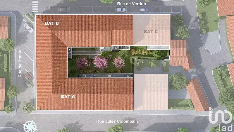 autour d’un jardin central paysager planté d’arbres de Judée.