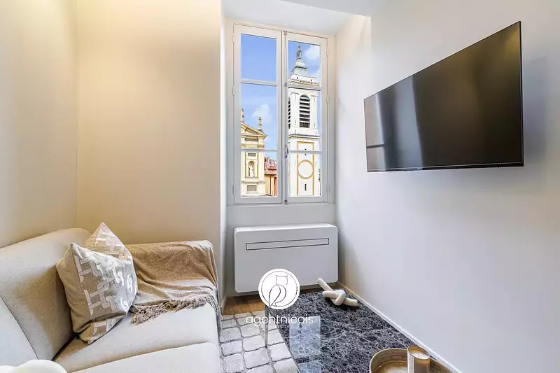 Appartement 2 Pièces traversant entièrement rénové d'une surface de 31 m² : Un sas d'entrée, un séjour lumineux avec une ouverture offrant une vue imprenable sur la place Rossetti.