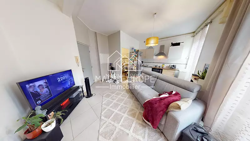 L'appartement est desservi de la façon suivante : Une entrée donnant sur un coin cuisine/séjour ouvert, une chambre ainsi qu'une salle d'eau avec WC. Une place de parking couverte vient compléter le bien. Possibilité d'acheter une cave en plus, sur demande.