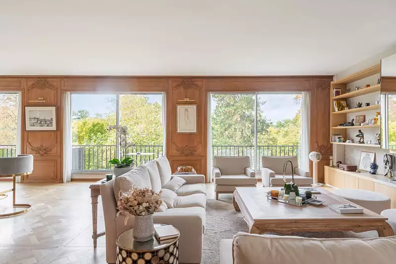 Situé entre le Bois de Boulogne et le Jardin du Ranelagh, appartement de réception au deuxième étage, desservi par ascenseur, offrant une vue panoramique sur le Bois de Boulogne. Au sein d’un bel immeuble en pierre de taille des années 1960, ce bien seul à l'étage se présente ainsi :