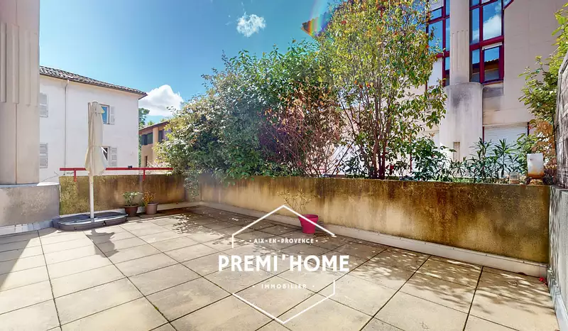 PREMI'HOME vous propose cet appartement T2 d'env 32m2 en 1er étage avec ascenseur, au sein d'une résidence sécurisée et bien entretenue, à deux pas du centre ville historique d'Aix en Provence, dans une petite rue au calme, avec sa terrasse d'env 25m2 au Sud donnant sur une cour avec fontaine. Il se compose d'une pièce de vie avec cuisine ouverte, donnant sur une veranda, avec accès à la grande terrasse (point d'eau et électricité), une chambre séparée avec placards de rangement aménagés, donnant également sur la petite véranda et la terrasse, une salle de bain avec baignoire et WC. Cave privative en rez-de-chaussée vendue avec l'appartement. Charges d'env 78€/mois incluant l'eau froide et l'entretien des communs. Taxe foncière 686/an. DPE: 183 / GES: 5.