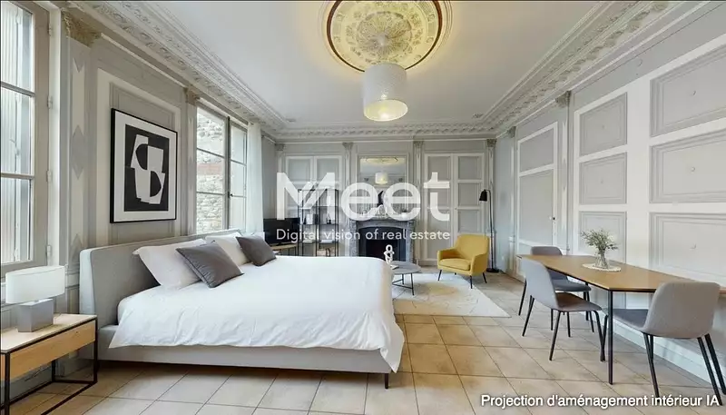 Ce bien cossu offre une belle hauteur sous plafond de 3 mètres, sublimée par des moulures, une cheminée ancienne, et une élégante rosace au plafond. Vous serez séduit par la luminosité de la pièce principale de 23,35 m², baignée de lumière grâce à de grandes fenêtres sans vis-à-vis.