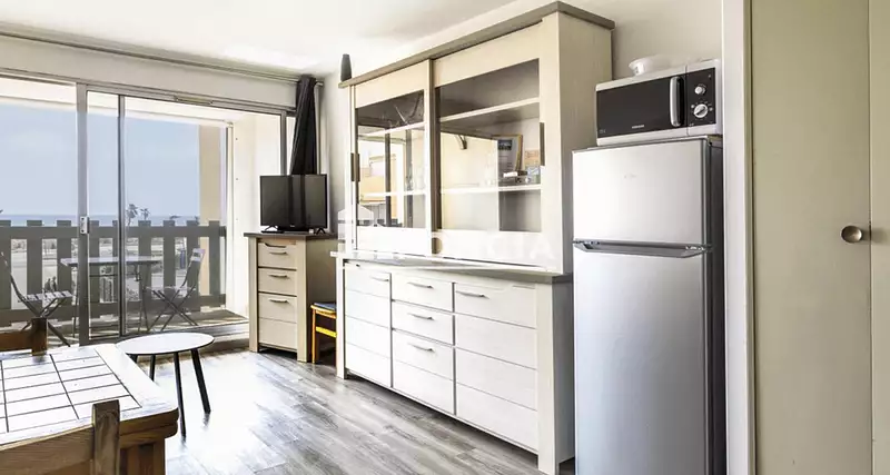Au 2ᵉ étage avec ascenseur, superbe appartement de 32 m² de surface habitable, bien rénové et cuisine aménagée, idéalement situé à deux pas de la plage et des commodités. Il se compose de :