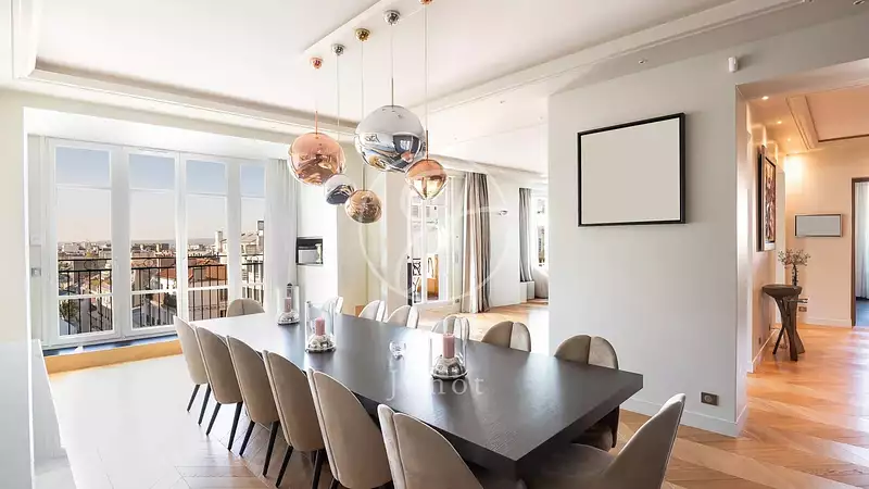 Proche de la place du Trocadéro et des commerces de la rue de Passy, au calme d’une rue recherchée, superbe duplex de 330m² niché aux sixième et septième étages d’un bel immeuble en pierre de taille.