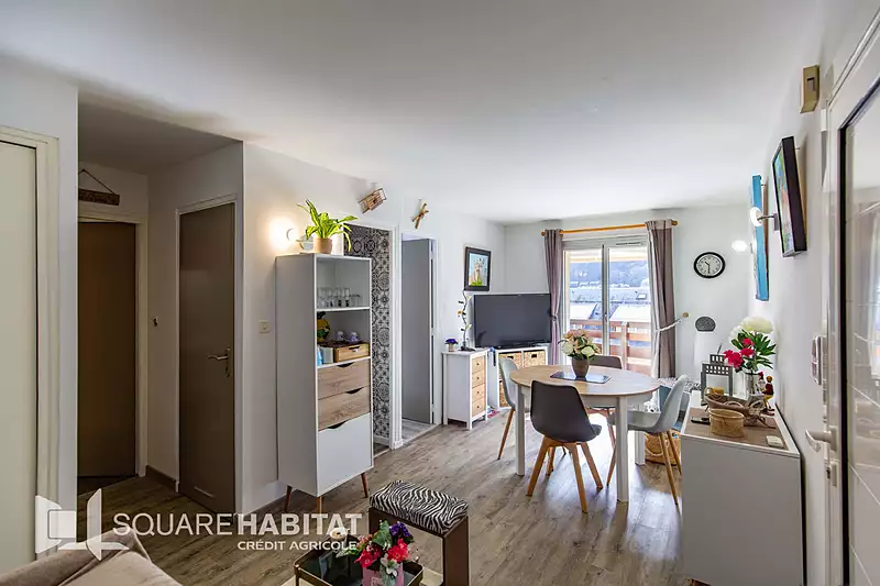 Dans un ensemble en copropriété des années 80, appartement d'environ 34m2 avec terrasse exposée plein SUD /EST offrant une vue dégagée sur la montagne. Il comprend une entrée avec un sas desservant un séjour lumineux , cuisine équipée indépendante, chambre, une salle d'eau et un wc séparé. Arrêt navette au pied de la résidence. Appartement entièrement rénové. Parking extérieur.