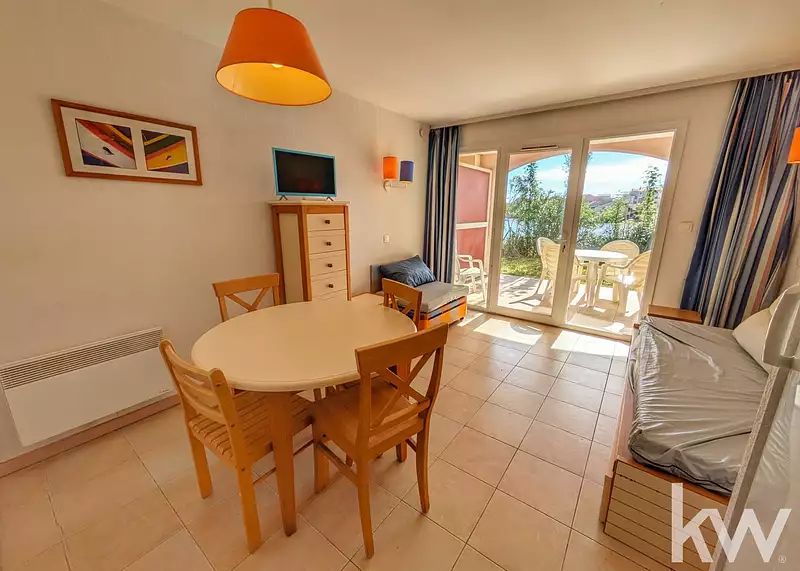 Cet appartement de 33 m² est situé au rez-de-chaussée. Il est composé d'un séjour avec cuisine, d'une chambre, d'une salle de bain et d'un WC séparé. Le séjour ouvre sur une grande terrasse avec une vue dégagée et au bord de l'eau.