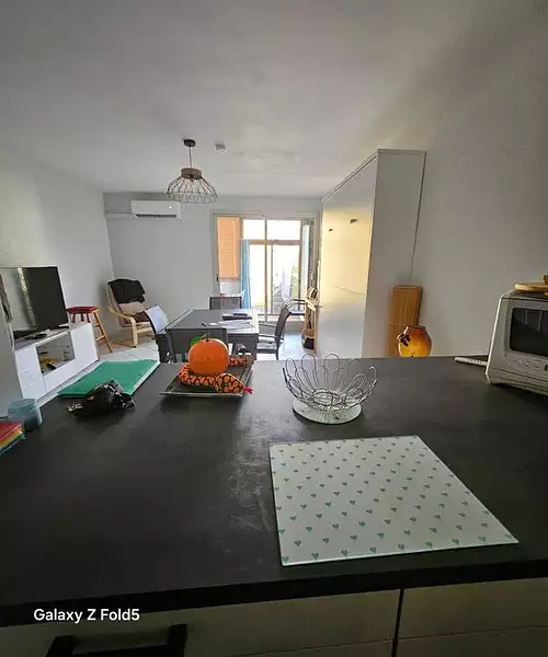 L'appartement se compose d'un espace de rangement à l'entrée, suivi d'une salle d'eau lumineuse avec fenêtre. Le coin jour se distingue par une belle pièce à vivre, lumineuse et moderne, avec une cuisine équipée autour d'un îlot central. Le séjour dispose également d'un canapé, d'une table, et d'un lit armoire rétractable (180x200), idéal pour optimiser l'espace. Cette pièce ouvre directement sur une véranda et un jardin privé, un véritable atout pour profiter du climat méditerranéen.
