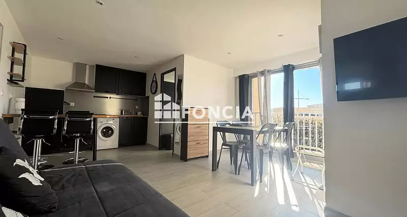Séjour lumineux ouvert sur une cuisine équipée (rangements, électroménager récent), offrant un espace convivial pour recevoir ou se détendre