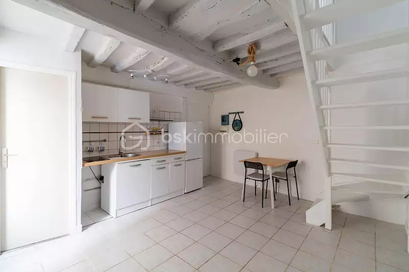 En plein centre ville, adorable duplex équipé d'une cuisine équipée, d'une salle d'eau avec douche et d'un coin salon. A l'étage, une belle chambre avec coin rangement.