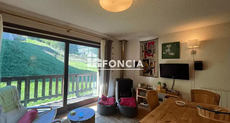 La pièce de vie, agrémentée d'une cheminée pour vos soirées d'hiver, s'ouvre sur un balcon où vous pourrez admirer le panorama montagnard. Une première chambre confortable et la deuxième chambre d'appoint complètent parfaitement cet espace de vie pensé pour votre bien-être en montagne.