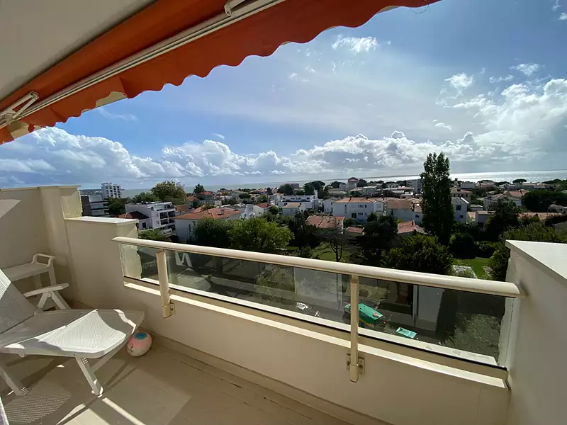 Exclusivité - ROYAN CENTRE - dans le quartier résidentiel de l'Eglise NOTRE-DAME, et à 600m de la Plage du CHAY - Au sixième étage d'une résidence sécurisée et disposant d'un ascenseur - STUDIO de 35m² env. en très bon état et comprenant : Entrée, salon/séjour donnant sur terrasse en Sud - Sud-ouest avec Vue dégagée sur la Mer, cuisine semi-ouverte sur le séjour, salle d'eau avec wc. Cave privative - parking extérieur commun. Environnement calme, avec une magnifique VUE sur la mer et la ville. (5.48 % honoraires TTC à la charge de l'acquéreur.) Copropriété de 223 lots - dont 90 lots habitation. (Pas de procédure en cours). Charges annuelles : 1345 euros.