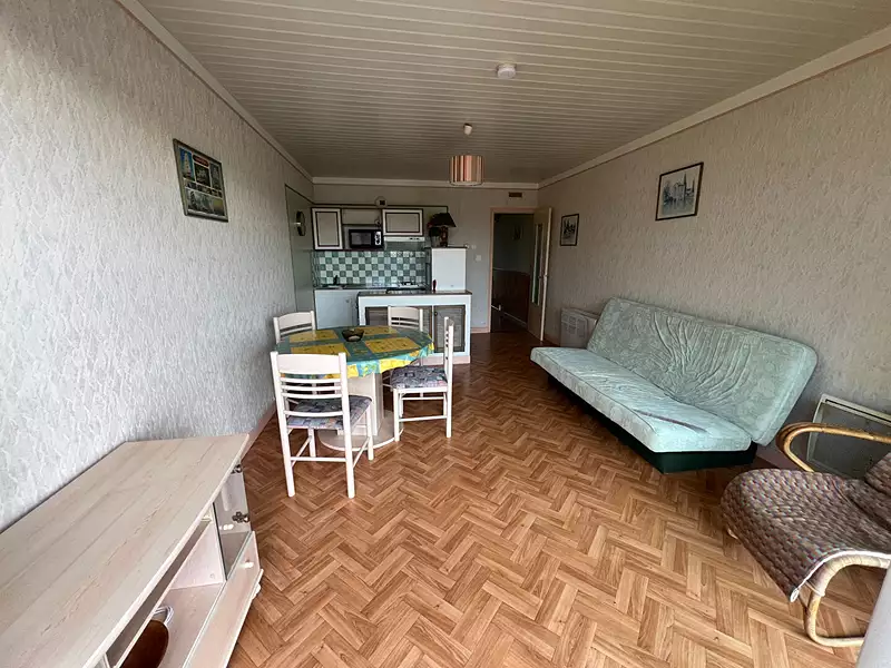Appartement au 1er étage expo sud comprenant entrée par véranda ,dégagement ,un coin nuit ,salle d'eau avec wc ,cuisine américaine ,séjour ,balcon ,garage et parking. Quelques travaux à prévoir.PROCHE PLAGE ET COMMERCES ! A SAISIR ! Copropriété de 48 lots - dont 17 lots habitation. (Pas de procédure en cours). Charges annuelles : 650 euros.