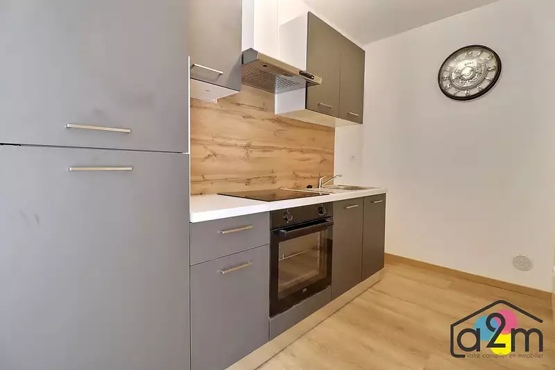 Dans une petite copropriété, appartement F2 entièrement rénové comprenant entrée, cuisine équipée et aménagée neuve ouverte sur le séjour, chambre, salle d’eau avec toilette. C/C gaz de ville. Cave.
