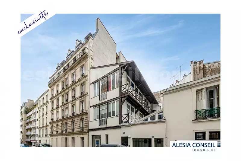 MONTPARNASSE - DENFERT-ROCHEREAU, ATELIER en DUPLEX 33 m² LC et 37 m² au sol au 2è étage d'un immeuble d'ateliers. Au 1er niveau le séjour 19m2 avec cuisine ouverte équipée et wc. À l'étage la chambre avec salle de bains.