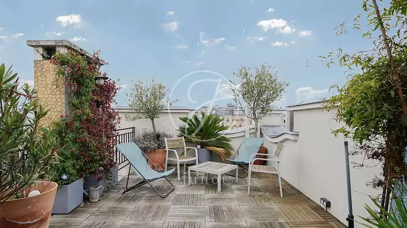 À l'étage, son somptueux toit terrasse de 32,49m² arboré et aménagé bénéficie d'une vue panoramique sur la tour Eiffel et tout Paris.
