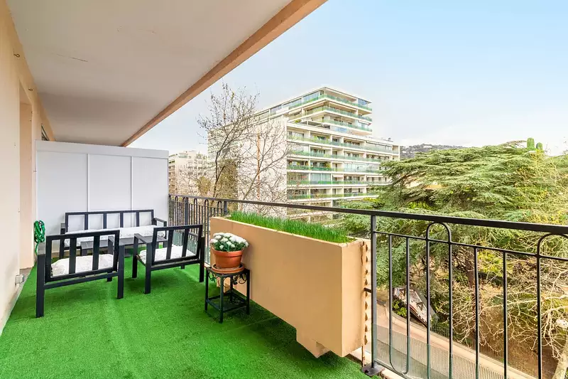 A Cannes, dans une résidence sécurisée avec ascenseur, un appartement lumineux et climatisé, 2 pièces de 36,56m² loi carrez au 4ème avec terrasse de 12,42m², composé de : une entrée avec placard, un séjour avec cuisine ouverte et une chambre donnant sur la terrasse, une salle d'eau et un WC.
