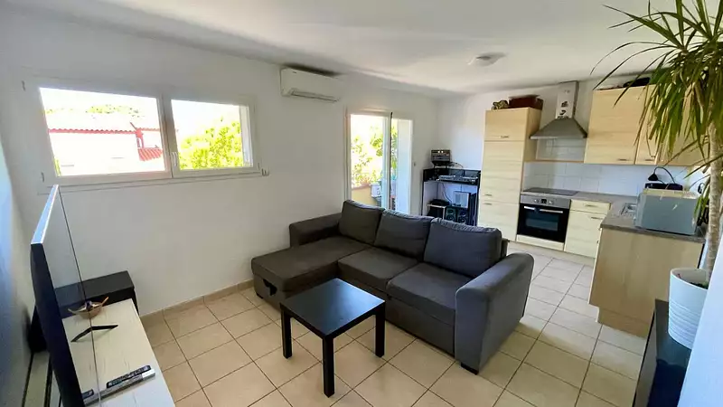 Il comprend une cuisine ouverte sur le séjour lumineux avec petite vue mer, une belle chambre spacieuse et une grande salle de douche.