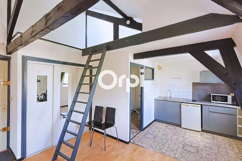 Vous serez séduits par sa grande pièce à vivre avec kitchenette, le tout pour 21,75 m2 lumineuse et pleine de cachet avec ses poutres apparentes