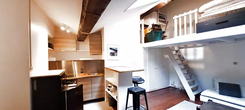 En plein coeur de la presqu'ile, st Nizier, appartement en dernier étage, très calme, entièrement refait , il se compose d'une piéce de vie avec cuisine américaine, dans la pièce de vie, une jolie mezzanine permet d'avoir un espace nuit ou de travail supplémentaire.