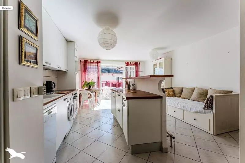 Gujan-Mestras, situé en hyper centre. Appartement T1 bis composé d'une pièce de vie/cuisine lumineuse exposée plein sud donnant sur sa terrasse de 12 m² avec store banne électrique, une alcove avec un grand placard, salle d'eau et wc séparé. Une place de stationnement. Proposition d'aménagement virtuel non contractuelle en dernière photo.