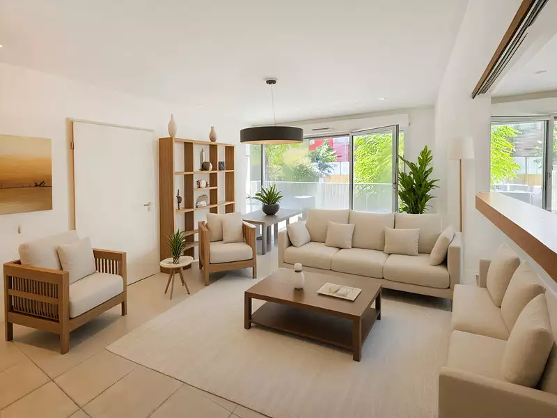Un séjour lumineux avec cuisine équipée ouvrant sur une terrasse ensoleillée d'une superfice de 12,25 m2.
