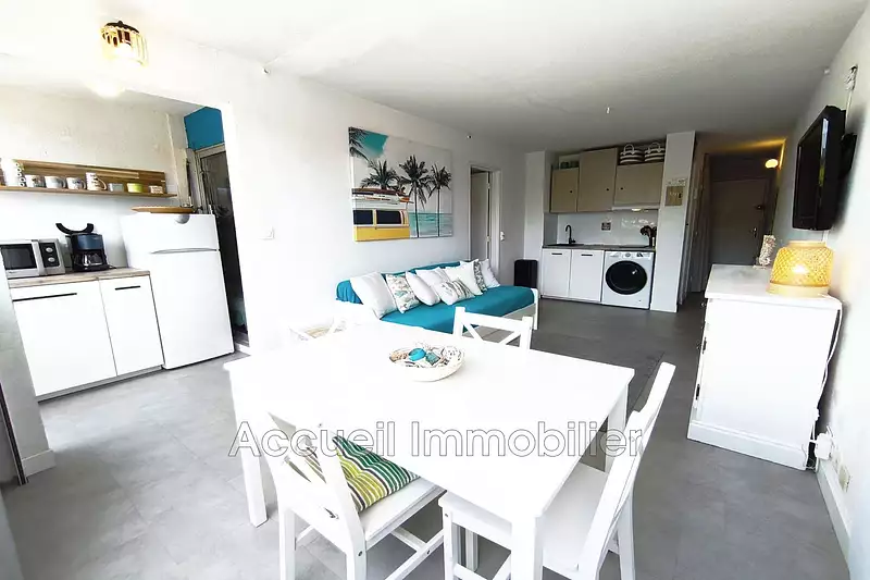 Vendu meublé, chambre avec placard, salle d'eau avec douche. Double vitrage, volet électrique, lave-linge + lave-vaisselle. Résidence sécurisée avec local à vélo fermé et boulodrome. Secteur Plage Sud, avec accès direct au port, à environ 100 m du chenal, 300 m de la plage et des commerces.