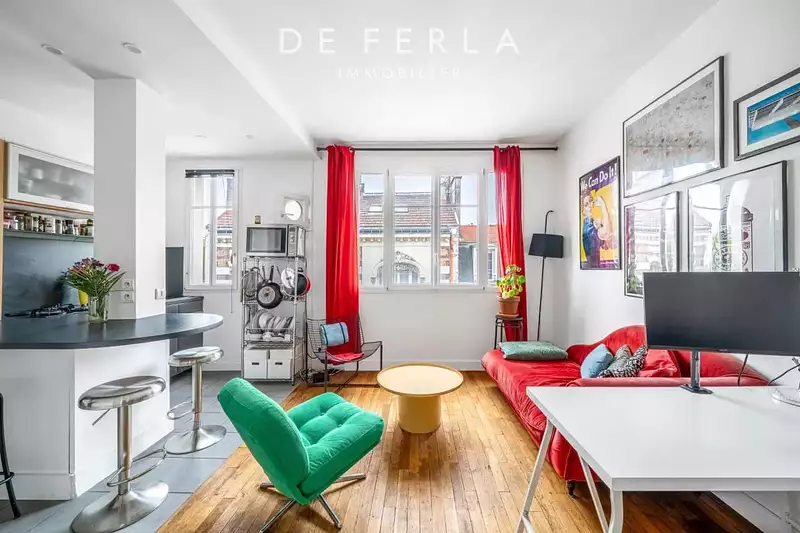 Au 4ème étage d'un immeuble années 50 de bon standing, avec gardien, un appartement 2 pièces de 39 m2 comprenant un séjour avec cuisine ouverte aménagée et équipée, une chambre avec rangements sur cour et une salle d'eau avec WC.