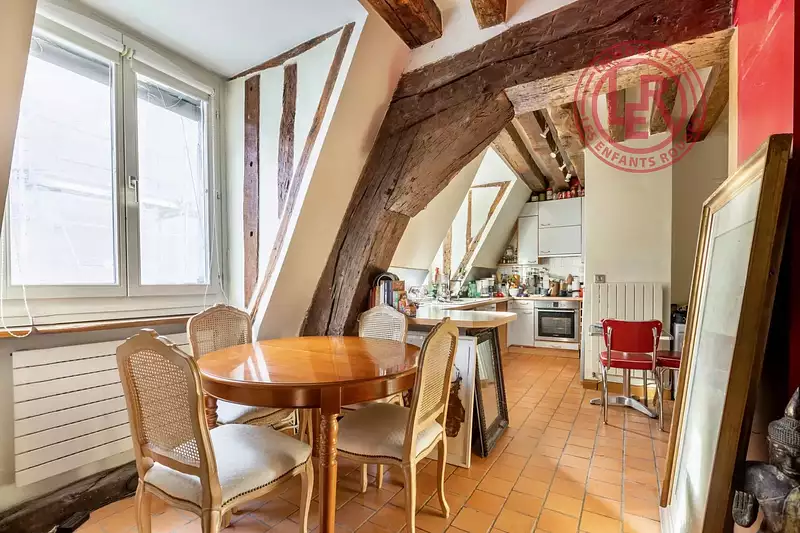 Au dernier étage d’un magnifique hôtel particulier de la rue de Saintonge, cet appartement de 40 m² est une pépite à transformer au cœur du Marais.